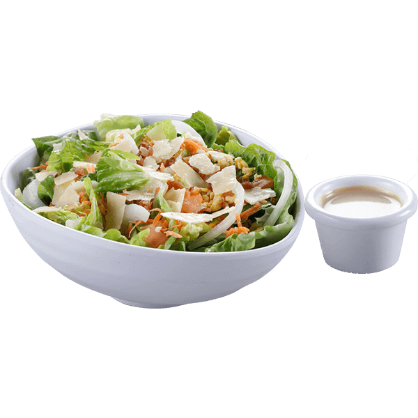 with Romaine lettuce, Tomato, Carrots, White Onion strips, Bacon bits, Boiled egg, Parmesan cheese & Caesar dressing